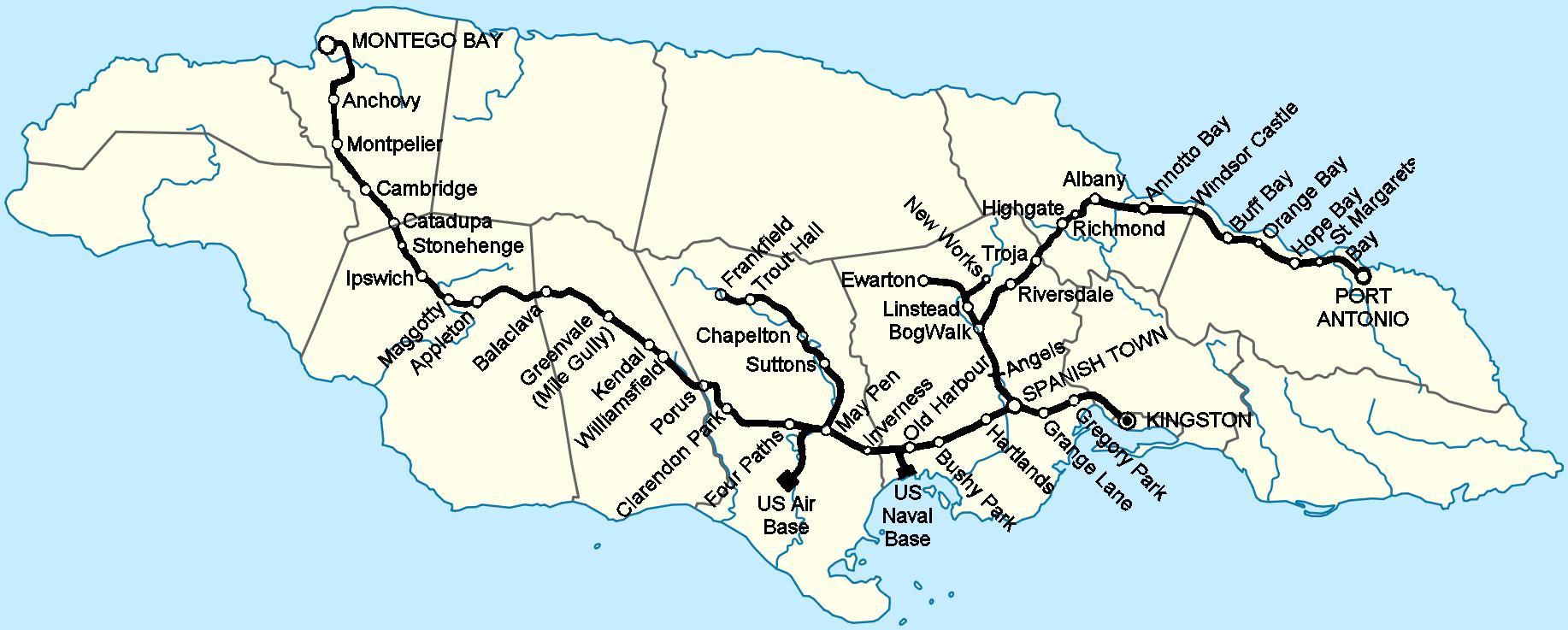 Mapa da jamaica, estação de comboios. Jamaica estação de trem (mapa Caribe, Américas) para imprimir. Jamaica estação de trem (mapa Caribe, Américas) para download.